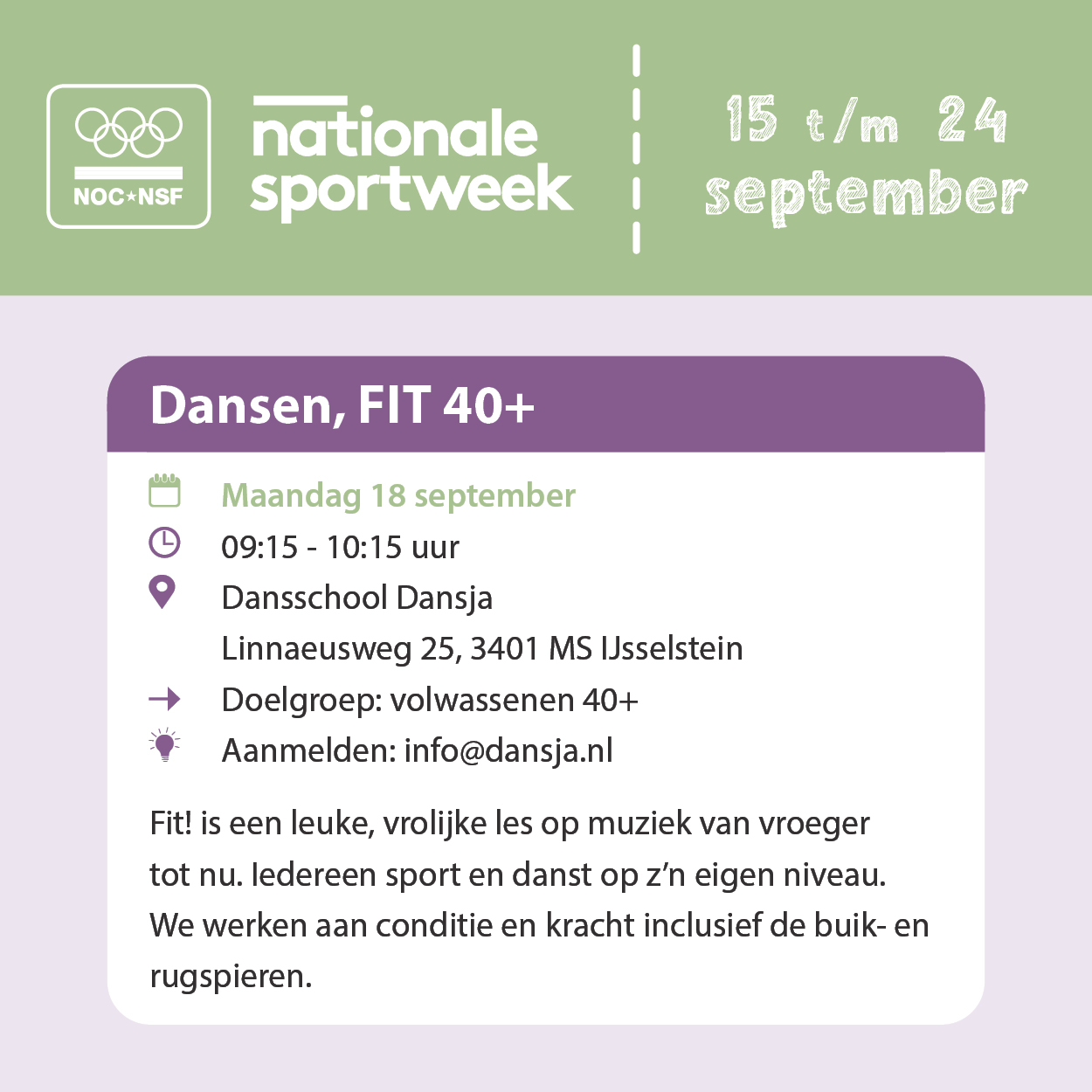Van 15 t/m 24 september is de Nationale Sportweek! In heel Nederland zijn er allerlei leuke activiteiten te doen om op een laagdrempelige manier kennis te maken met sport en bewegen. Ook in IJsselstein zijn er allerlei leuke dingen te beleven voor jong en oud! Bekijk hier het programma en meld je aan om met een (proef)les mee te doen!